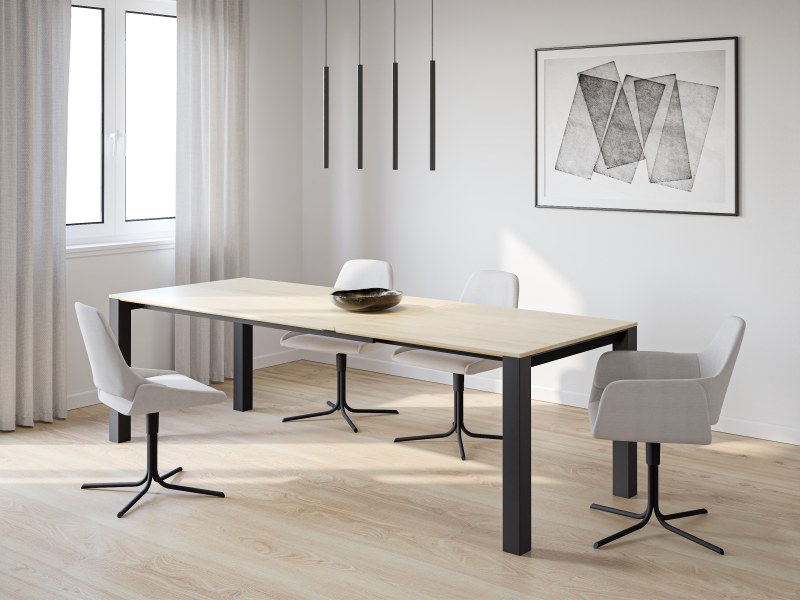 Das Modell ET410-KA vereint ausgefeilte Funktion mit markantem Design. Das innovative Aluauszugssystem ist mit Flachklappmechanik ausgestattet und sorgt mit einer Zargenhöhe von nur 50 mm für maximale Beinfreiheit. Dies ermöglicht auch mit Armlehnenstühlen komfortables Sitzen. Die lichte Höhe unter der 25 mm starken Massivholzplatte beträgt lediglich etwa 80 mm unterhalb der Tischhöhe – ideal für großzügigen Sitzkomfort.