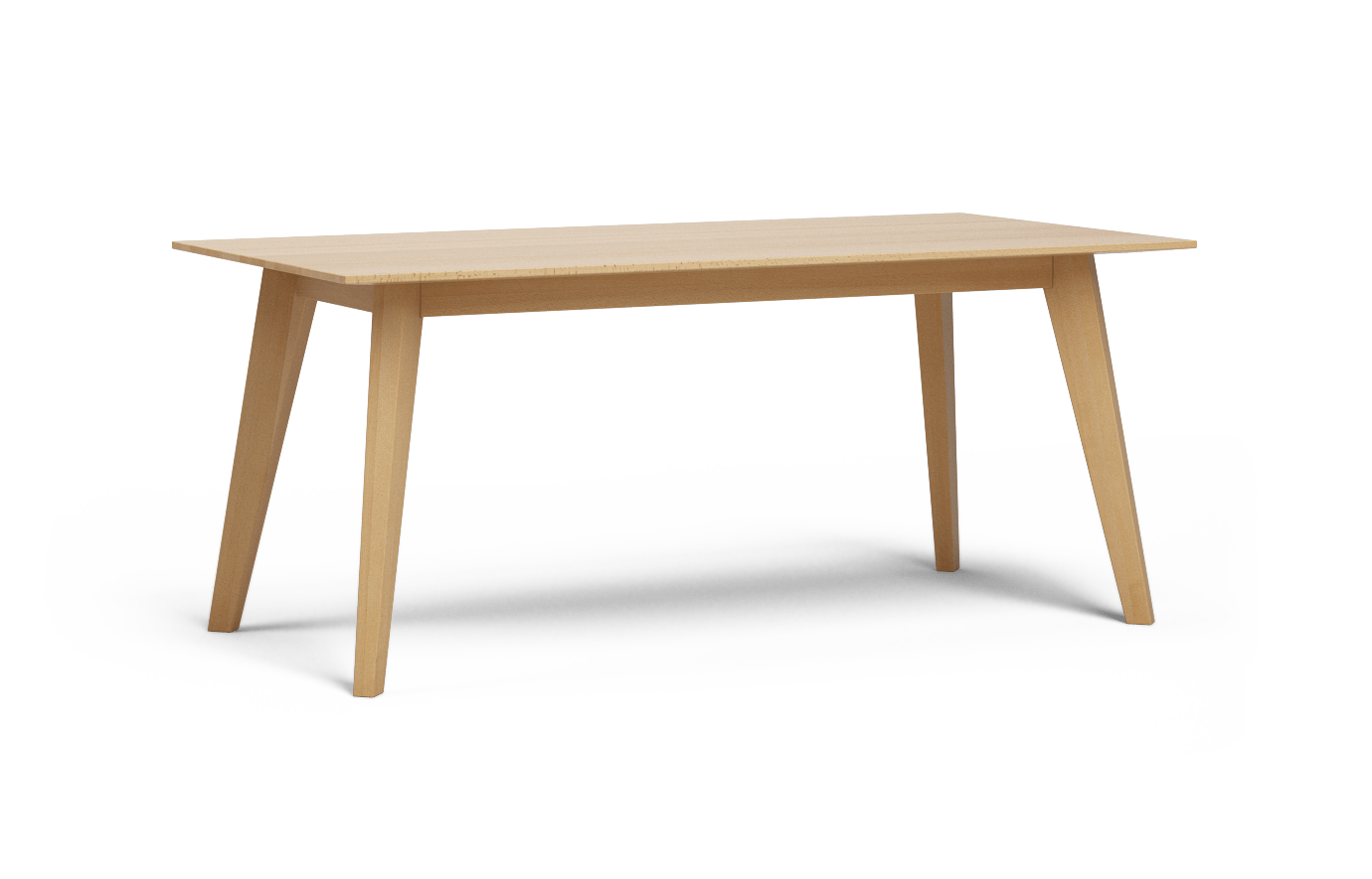 Zunächst erhält die Tischplatte durch die „Schweizerkante“ ihre prägnante Form. Dabei wird die Platte auf der Unterseite angeschrägt und wirkt dadurch schlank ohne nennenswert an Robustheit einzubüßen. So gewinnt die Platte einen guten Überstand gegenüber den Tischbeinen, die in Richtung Unterseite verjüngend, um 10° angewinkelt und um 45° gedreht, verlaufen.